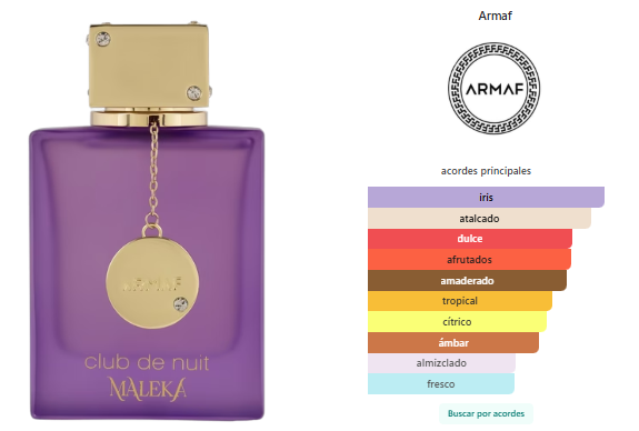Club De Nuit Maleka de Armaf es una fragancia de la familia olfativa Floral Frutal para Mujeres. Esta fragrancia es nueva. Club De Nuit Maleka se lanzó en 2025. La Nariz detrás de esta fragrancia es Olivier Cresp. Las Notas de Salida son lichi, bergamota y pimienta rosa; la Nota de Corazón es raíz de lirio; las Notas de Fondo son praliné, sándalo y ambroxan.