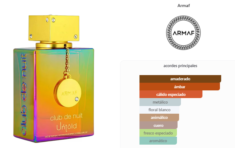 Club de Nuit Untold de Armaf es una fragancia de la familia olfativa para Hombres y Mujeres. Club de Nuit Untold se lanzó en 2022. Las Notas de Salida son azafrán y jazmín; las Notas de Corazón son Amberwood y ámbar gris; las Notas de Fondo son resina de abeto y cedro.