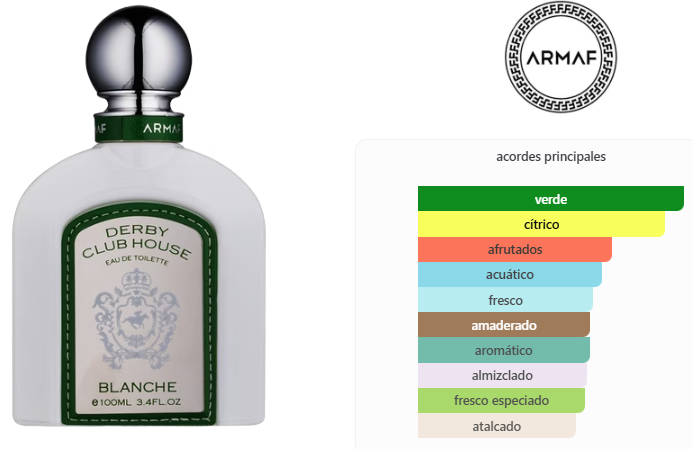 Derby Club House Blanche de Armaf es una fragancia de la familia olfativa Aromática Acuática para Hombres. Las Notas de Salida son notas acuáticas, bergamota y naranja; las Notas de Corazón son té verde y grosellas negras; las Notas de Fondo son almizcle, gálbano y sándalo.