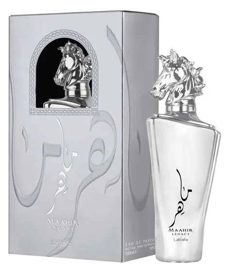 Maahir Legacy de Lattafa Perfumes es una fragancia de la familia olfativa para Hombres. Maahir Legacy se lanzó en 2023. Las Notas de Salida son lima (limón verde), menta, toronja (pomelo), lavanda y piña; las Notas de Corazón son pimienta negra, romero, baya de enebro, geranio y Incienso; las Notas de Fondo son ambroxan, vetiver, musgo de roble, cachemira y haba tonka.