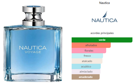 Nautica Voyage de Nautica es una fragancia de la familia olfativa Amaderada Acuática para Hombres. Nautica Voyage se lanzó en 2006. La Nariz detrás de esta fragrancia es Maurice Roucel. Las Notas de Salida son hojas verdes y manzana; las Notas de Corazón son flor de loto y mimosa; las Notas de Fondo son almizcle, cedro, musgo de roble y ámbar.